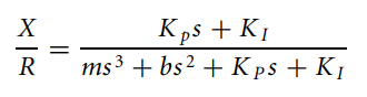 이때 R 이라는 원하는 위치 값(혹은 경로 입력값)(reference position)을 주고 이를 맞추기 위해 PI(Proportional-intergral) motion controller가 적용된다해보자. 그때 식은 아래와 같이 표현될 수 있다.