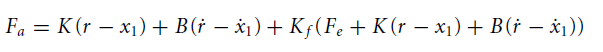 식을 음미해보자. K와 B의 경우 일반적인 시스템 모델링 처럼, 위치값과 속도값에 대한 에러를 feedback 하였다. 즉, K와 B는 motion에 대한 P,D gain이 된다. Kf의 경우 force에 대한 피드백 게인이 된다. 환경과 상호작용이 없을 때 Fe = 0 이 되면서 Fa는 단순히 PD 제어가 된다.