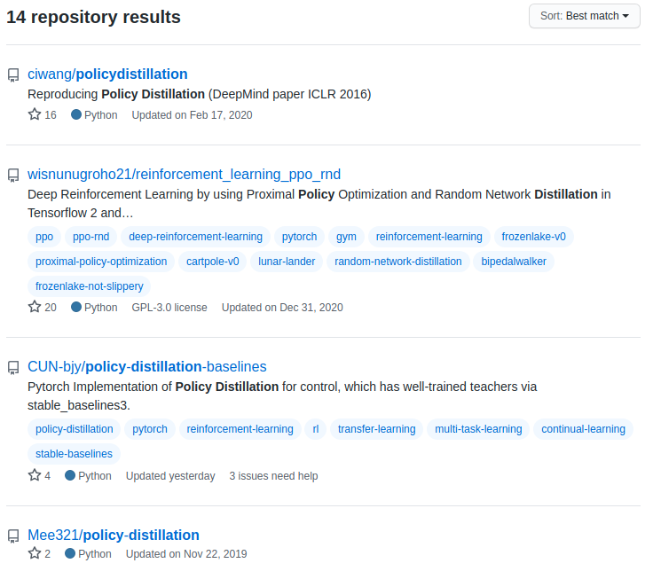 policy distillation은 현재 연구중인 논문과 관련해 찾아보다가 유용하게 쓸 수 있겠다 싶어 자세히 공부하고 있었던 개념이다. 근데 생각보다 Github에 control task를 위한 policy distillation 모듈이 제대로 구현되어있는 repo가 없다는게 함정이다. 나름 DeepMind에서 나온 논문이고 쓸만하다고 생각하는 개념인데 인기가 생각보다 없나보다...T.T