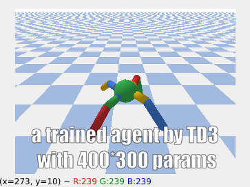 위 데모영상은 Gym 환경에서 TD3알고리즘을 이용해 Ant task를 학습한 trained agent와 policy distillation 알고리즘으로 경량화한 distilled agent이다.