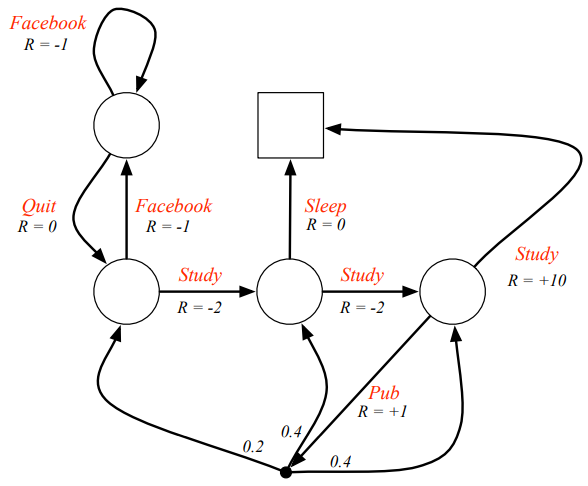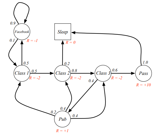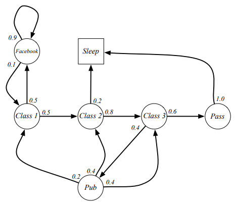 확률이 정해져 있고 이를 <s,p>로 표현한다. s는 state이며, 아래 사진은 학생의 Markov chain을 나타낸다.