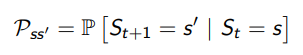 간단하게 State가 s일 때 t+1시간에서 state가 s'일 확률값이 state transition probability된다.