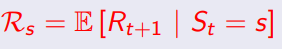 기본적인 Markov Process가 각 state들의 확률이 정해져 있었다면, MRP는 각 state들에 대한 Reward가 정해져 있는 형태이다. MRP는 <S,P,R,gamma>로 표현 된다. 여기서 R은 reward함수로 아래와 같이 평균값 평태로 표현된다.