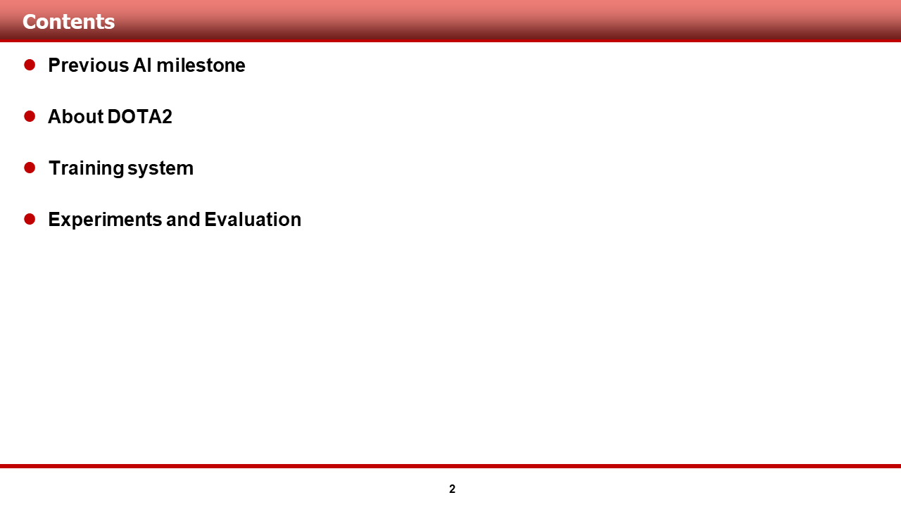 목차는 다음과 같습니다. 가장 먼저 AI, 특히 RL이 이루어낸 이전의 마일스톤들에 대해 간단히 설명을 드리고, Dota2가 어떤 게임인지에 대한 설명을 드린뒤, 본론인 training system관련 내용과 실험 및 결과를 평가한 내용에 대해 준비 하였습니다.