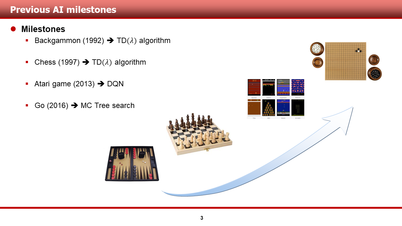 강화학습을 연구하는 많은 연구진들은, 실제 세상의 복잡하고 연속적인 문제를 풀 수 있는 AI를 설계하기 위한 초석으로써, 게임이라는 환경을 많이 선택해오곤 했습니다. 그리하여, 그림에 표현된 것 처럼 1992년 비교적 간단한 게임인 Backgammon을 고전적인 알고리즘인 TD - labmda algorithm을 통해 해결하기도 하였습니다.