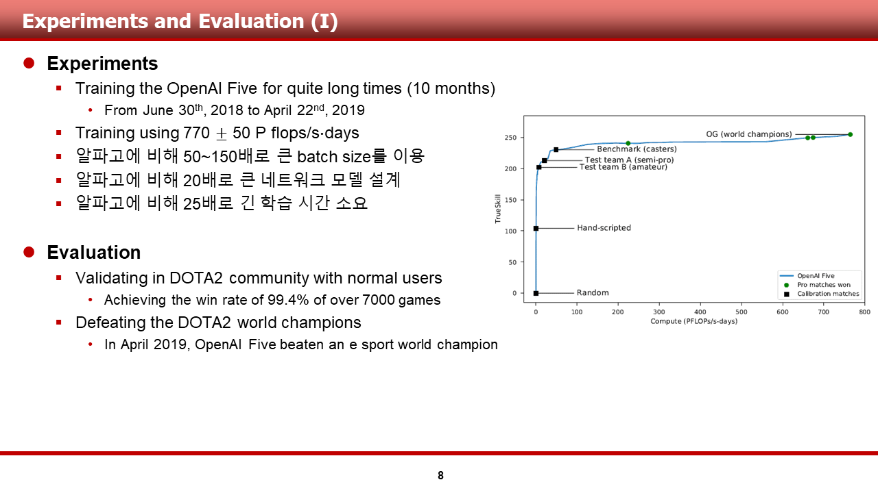 이러한 신경망 구조와, 학습 방법을 이용하여 Open AI는 약 10개월 동안 학습을 수행했다고 합니다. 이 10개월 간 신경망의 학습에는 약 770 P flops/s.day의 연산이 수행 되었다고 하는데, 정말 엄청난 스케일이 아닌가 하는 생각이 듭니다..