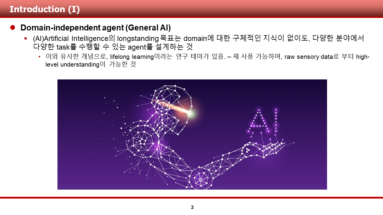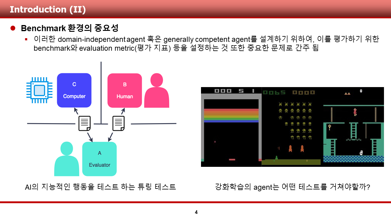 가장 먼저, ALE 논문에서 강조하는 domain-independent agent에 관련한 내용에 대한 설명과, 강화학습 알고리즘을 설계하는데에 있어 Benchmark 환경의 중요성이 무엇인지에 대해 도입부에서 설명드리려 합니다.