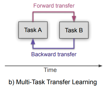 transfer learning은 이전에 한가지 도메인에서 습득한 지식을 다른 새로운 도메인의 문제를 해결하기위한 접근법이다. 조금더 구체적으로 이야기 하자면, forward transfer란 Task A가 미래의 Task B의 성능에 영향을 주는 것을 의미하며, backward transfer란 현재의 Task B가 이전의 Task A의 성능에 영향을 주는 것을 의미한다.