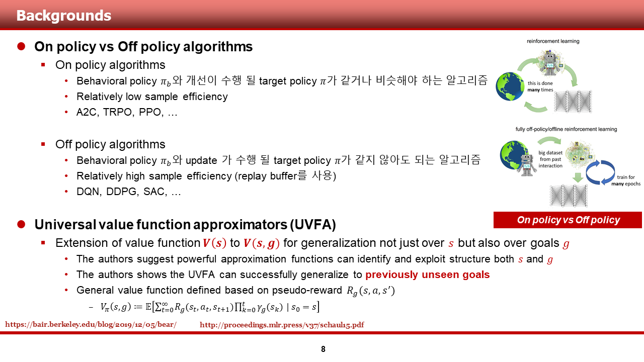 그 후, 본론에서는, HER을 더욱 잘 이해하기 위한 배경에 대해(on policy vs off policy, UVFA) 설명 드리고, HER에 대한 본 설명을 진행하도록 하겠습니다.