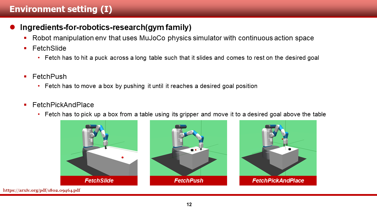 먼저, 저자들이 실험을 수행한 환경에 대해 간단히 소개해드리고 넘어가도록 하겠습니다. 저자들은, 앞서 도입부에서 설명드렸던 FetchPush을 포함하여 gym robotics의 세개의 환경을 사용했습니다. 각각의 환경에 대한 소개는 슬라이드에 기술되어 있는 문장을 참고하시면 될 것 같습니다.