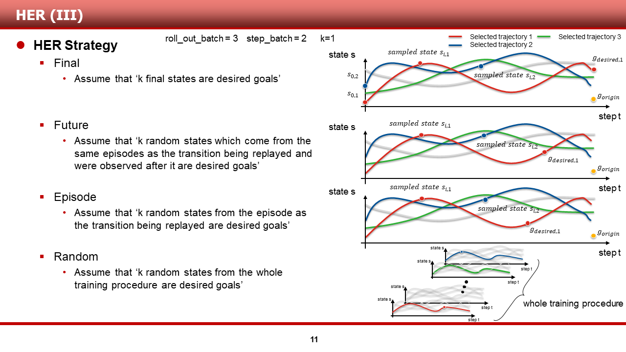 다음 슬라이드 부터는, HER에서 additional goal을 sampling할 때 사용한 strategy(전략) S 에 대해 설명드리겠습니다.