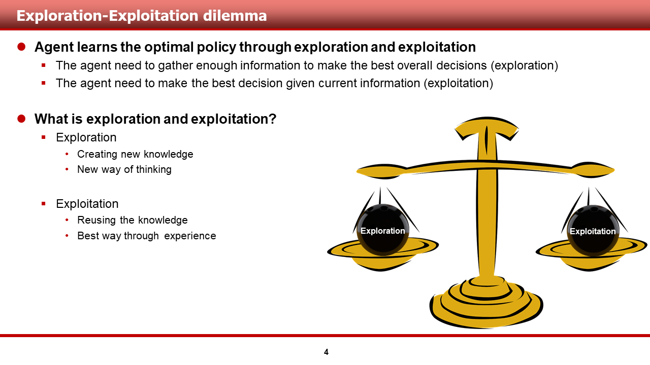 강화학습의 최종적인 목표는, 주어진 문제를 해결하기 위해 agent가 최적의 가치 함수 및 정책을 학습 하는 것입니다. 이를 위해서, agent는 탐험과 이용을 적절히 배분할 필요가 있습니다. 각각의 역할과 특성은 다음과 같습니다.