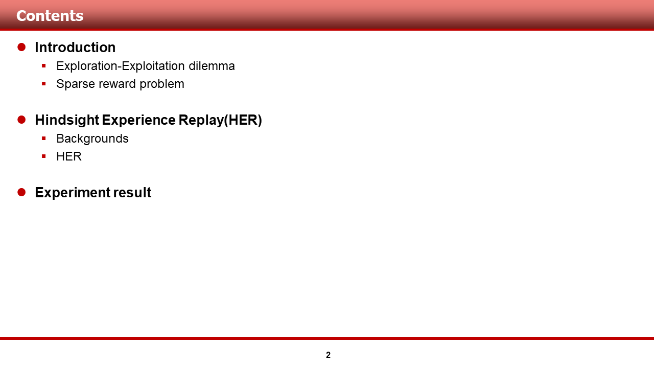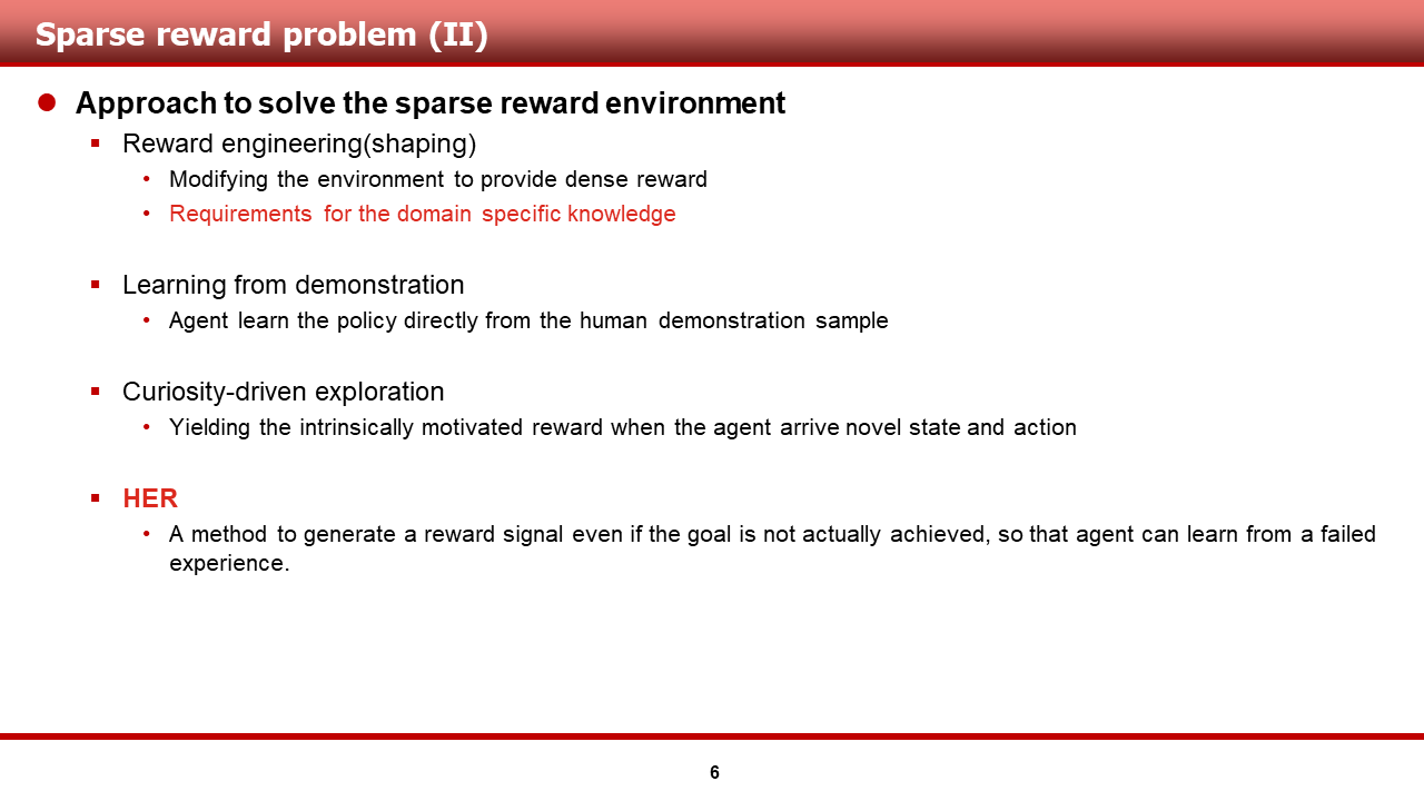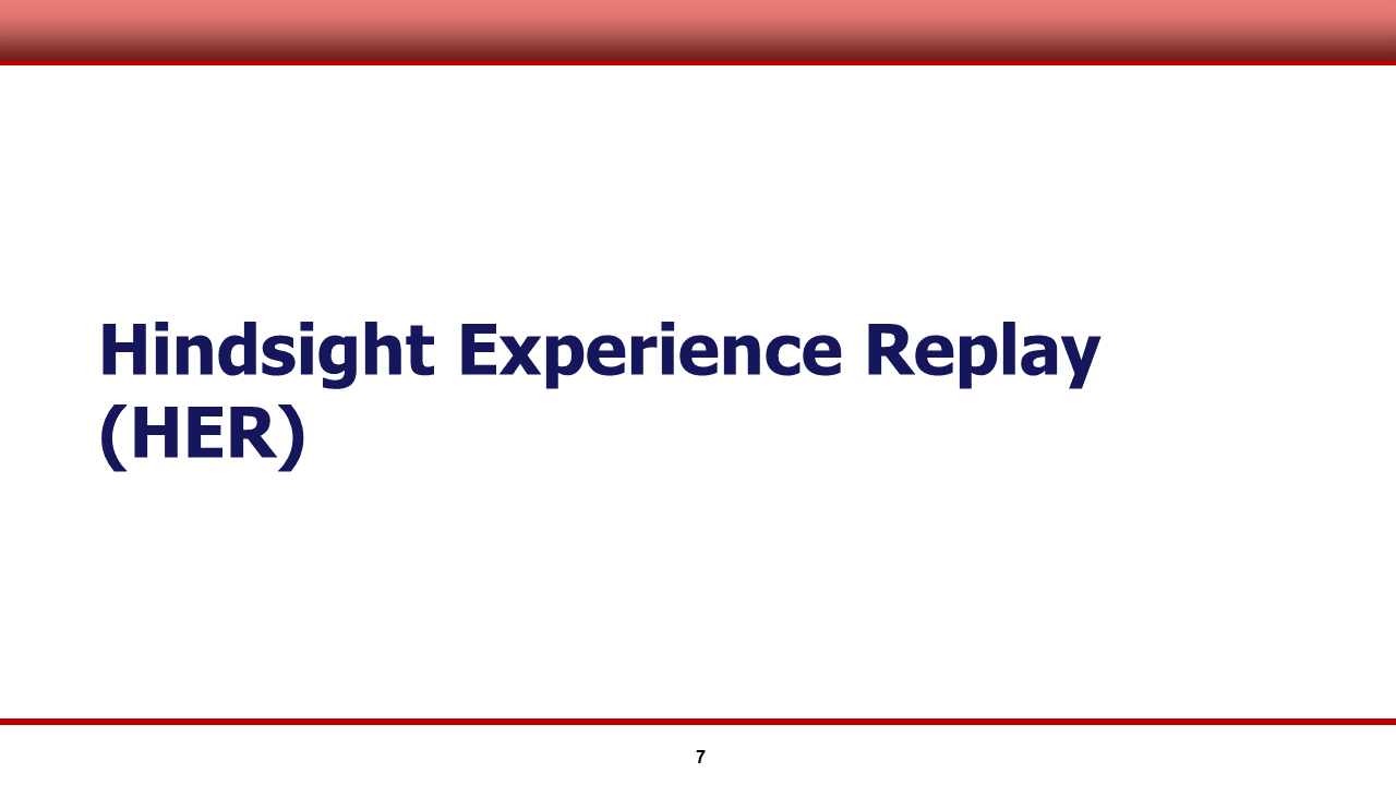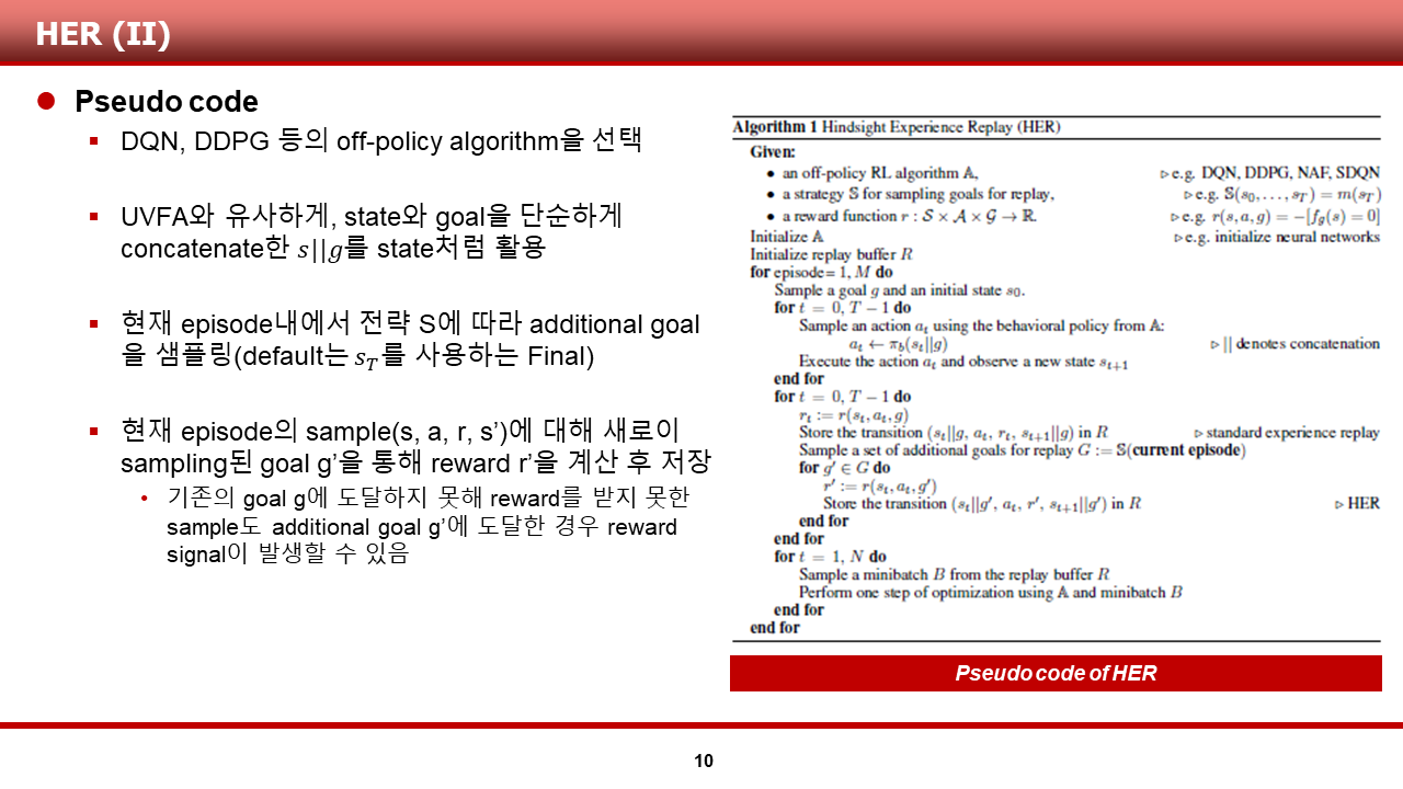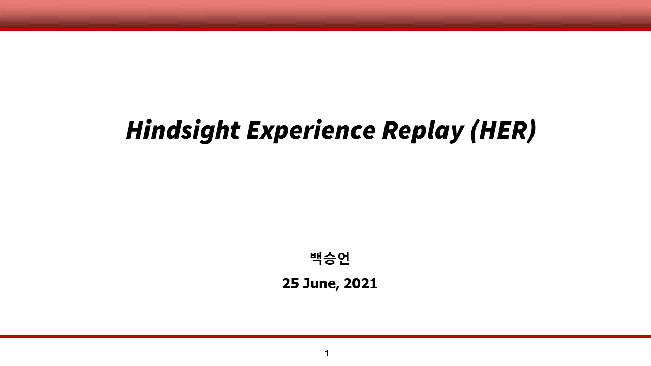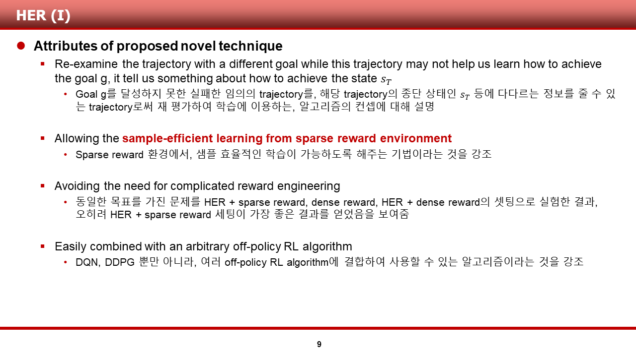 다음 슬라이드 부터는, 이러한 평가를 내린 HER 알고리즘에 대해 본격적으로 다루도록 하겠습니다.
