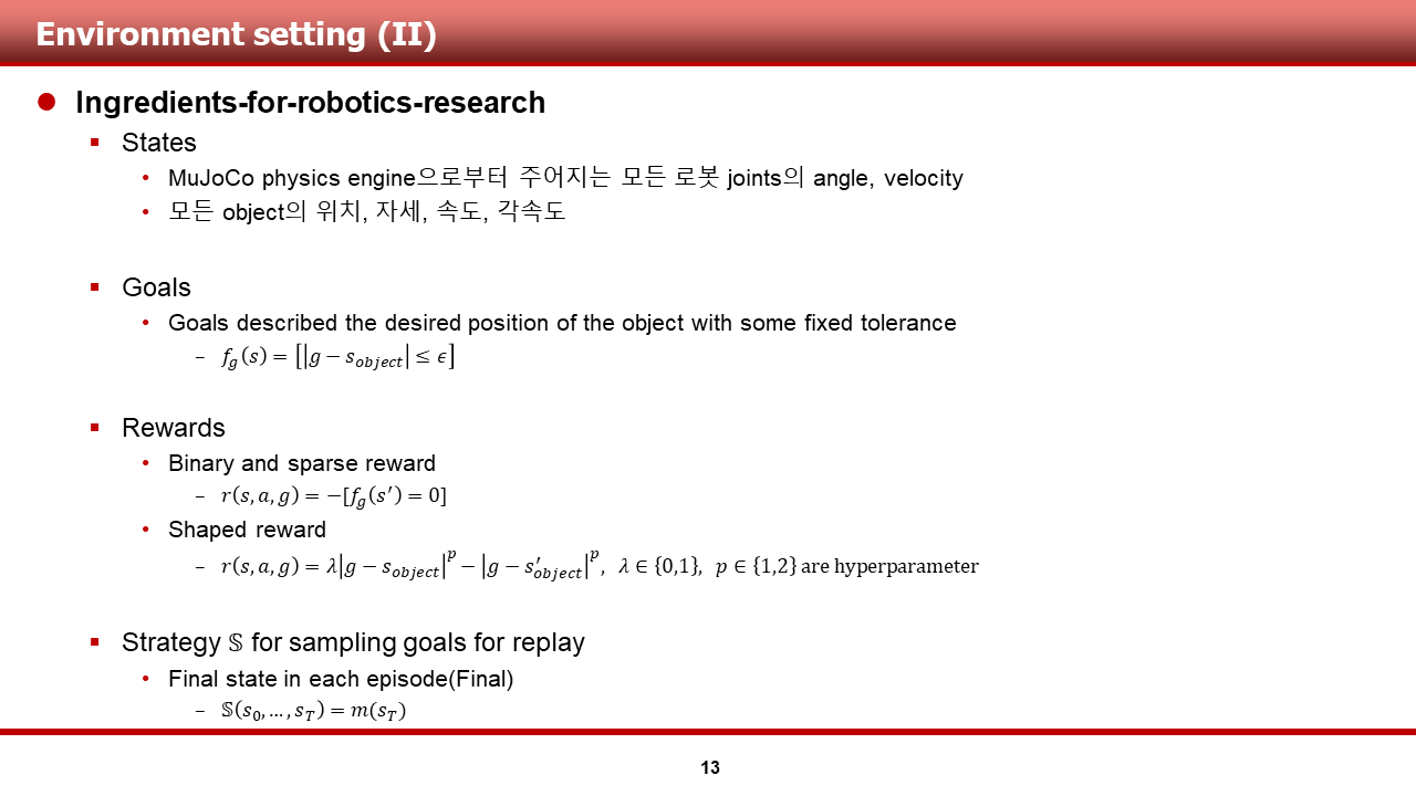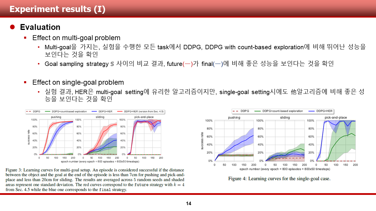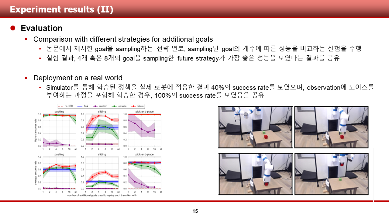 저자들은 이러한 goal sampling 전략에 따른 HER의 성능을 테스트하는 것을 포함하여, 여러 실험을 수행 하였으며, 다음 슬라이드부터는 실험 결과에 대해 설명 드리도록 하겠습니다.