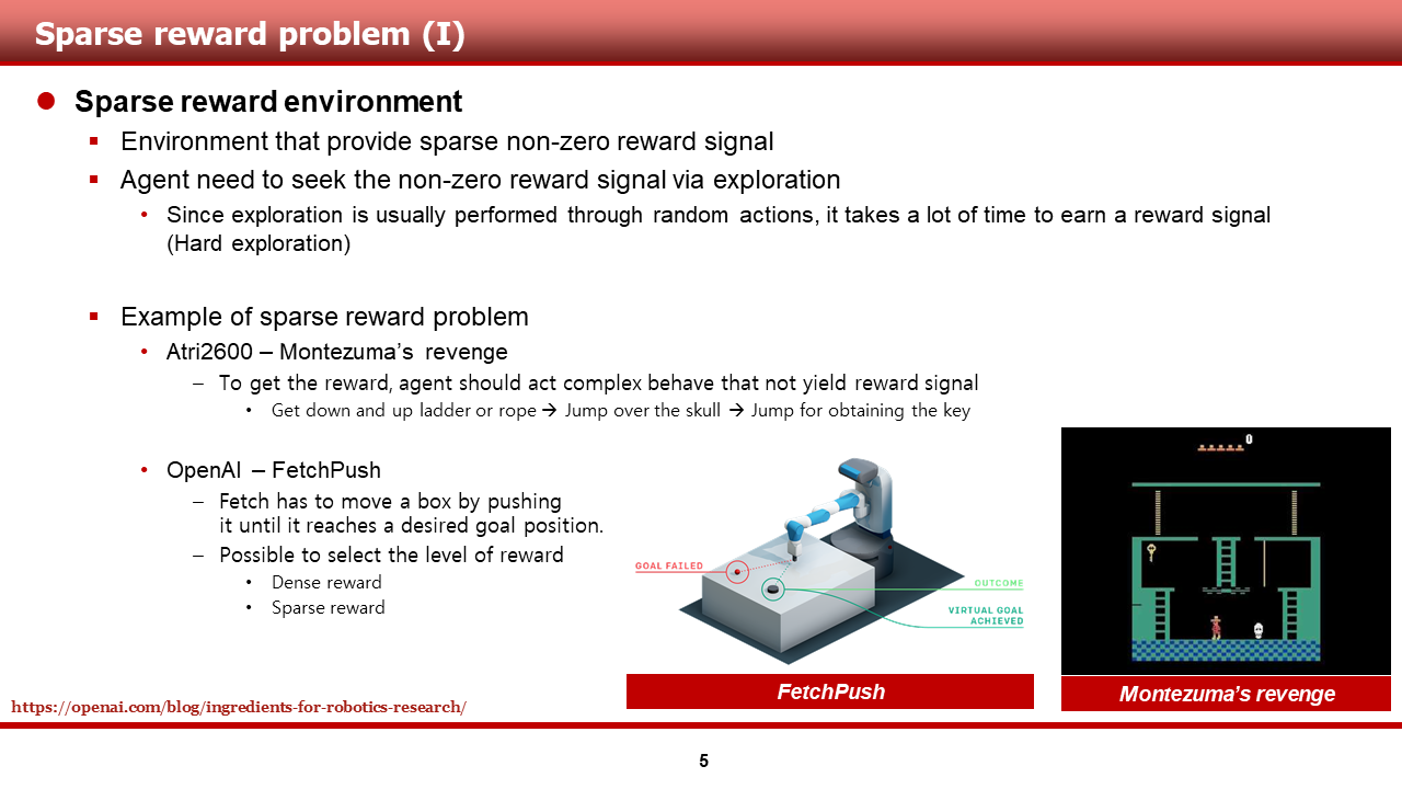 앞서 말씀드린 충분한 탐험의 문제는, 특히 희소 보상(sparse reward) 환경에서 더욱 중요한 문제로 떠올랐습니다. 희소 보상 환경이란, 환경 자체가 non-zero reward signal을 굉장희 희소하게 제공하는 경우를 뜻합니다.