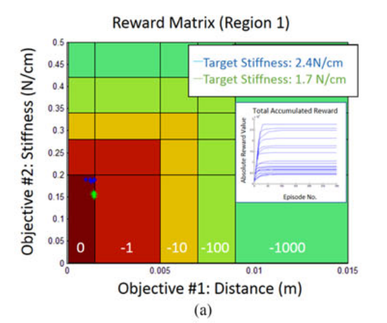 논문에서는 position과 stiffness를 목적으로 두는데, 각 목적에는 5개의 지역을 만들어서 값을 줄여가면서 부여해줬다. 두 목적을 합쳐서 3차원 공간에서 1.5mm안쪽으로, 그리고 그 위치에서 0.2N/cm의 강성을 가지는 경우에 absorbing state에 도달했다고 하였다.