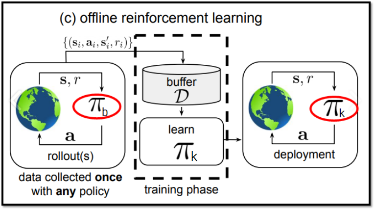 - 오프라인 강화학습은 환경과의 상호작용 없이, 대규모로 수집된 데이터셋에서 학습됨
