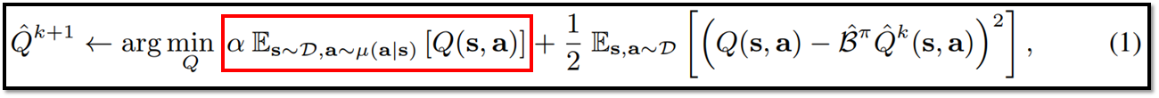 - 핵심 아이디어 : state-action 쌍인 µ(s,a)의 특정 distribution, 그 중에서 Dataset D에 없는 action도 포함하는 Q-function을 계산하는데, 이에 대한 Q-function 값을 최소화시킴 (수식 1의 빨간 박스 영역)