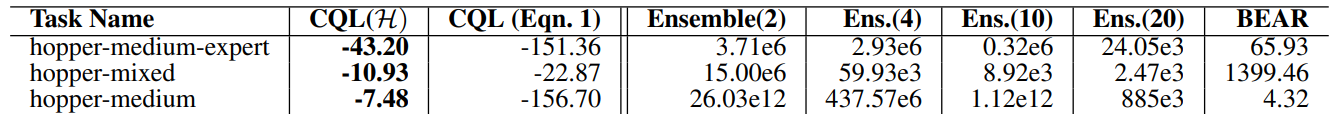 - CQL(ρ)는 고차원 action space에서 더 안정적으로 수렴하며, 이에 대한 분석은 6.Experimental Evaluation의 Table 2에서 진행할 예정.