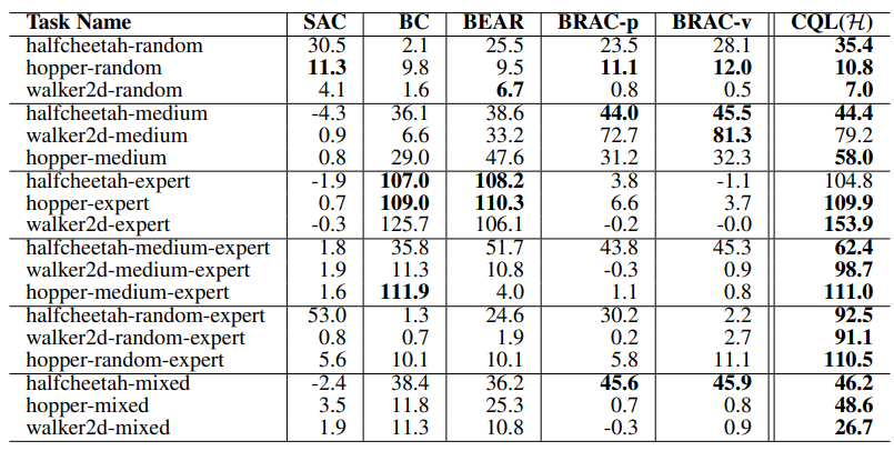 - CQL 모델 1과 비교한 이전 offline RL 모델들 : BEAR, BRAC, SAC, BC