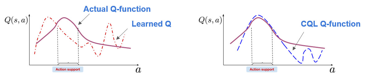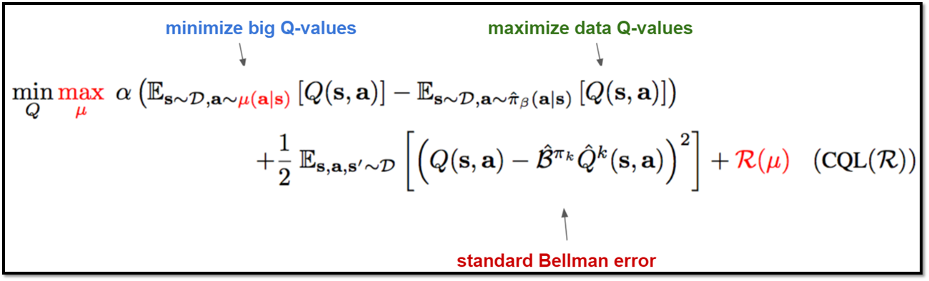 - 핵심 아이디어 : (상태-행동) 데이터에 대한 적절한 분포 아래에서 Q-값을 최소화하고, 이를 데이터 분포에 대한 최대화 항과 결합하여 이 경계를 더 강화하는 것.