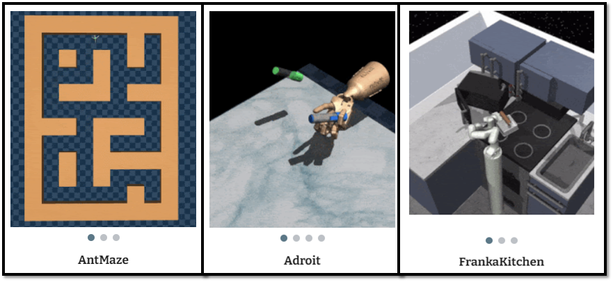 - Kitchen : 9자유도의 로봇 머니퓰레이터 제어를 해야 하며, 역시 CQL 성능이 가장 뛰어남