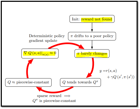 - 특히, 학습 초반에 reward를 받는 것이 충분하지 않을 때, 이러한 순환 메커니즘으로 인해 actor network도, critic network도 더 이상 발전할 수 없는 deadlock 상태를 초래할 수 있다는 것을 보여준다.