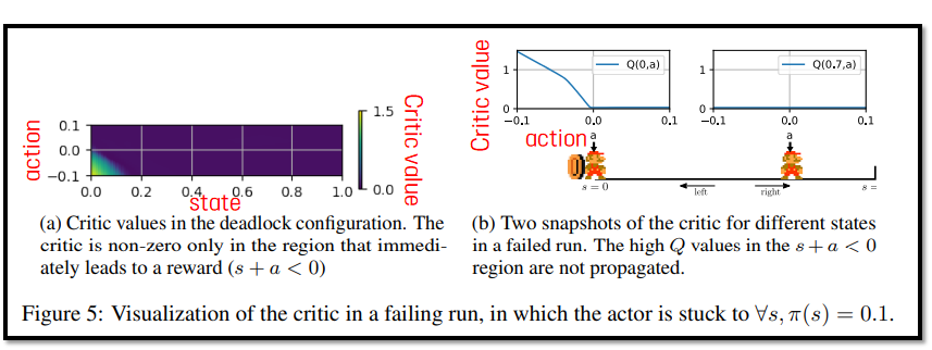 - Figure 5-(a)를 보면, reward의 값이 reward가 발견되는 지역(s+a < 0) 밖으로 올바르게 전파되지 않음을 볼 수 있다. (state > 0.1 이상에서는 critic value가 모두 0인 것을 볼 수 있음)