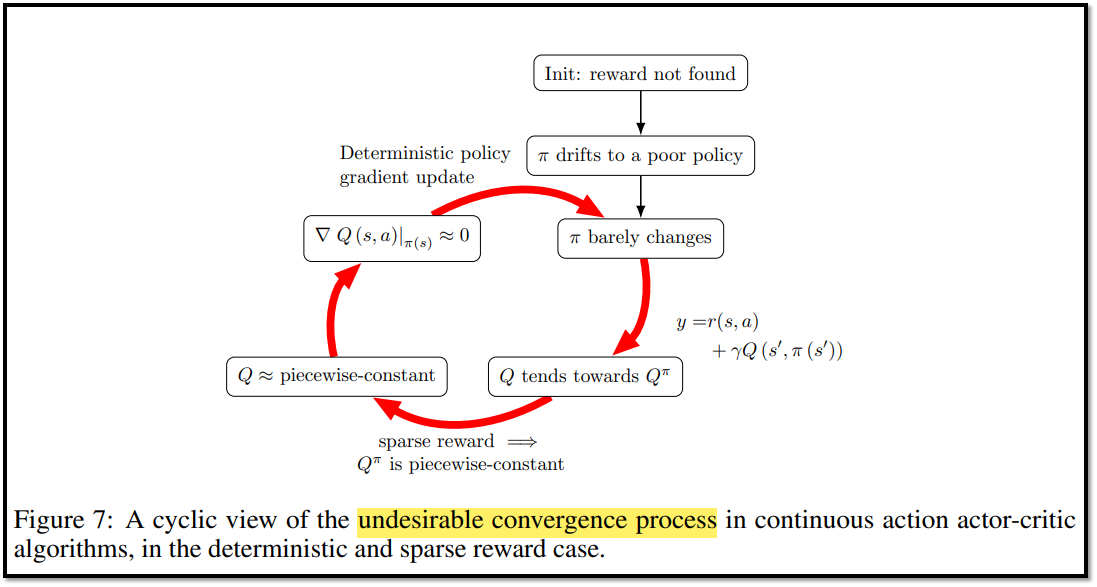 - 4절에서 DDPG와 TD3와 같은 actor-critic 알고리즘은 Figure 7에서 의존성이 강조된 세 가지 요소의 조합으로 인해 초기 수렴이 poor policy로 이어진다는 것을 보여줬다.