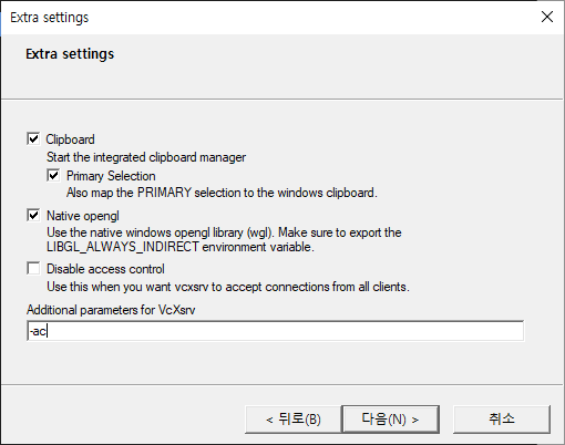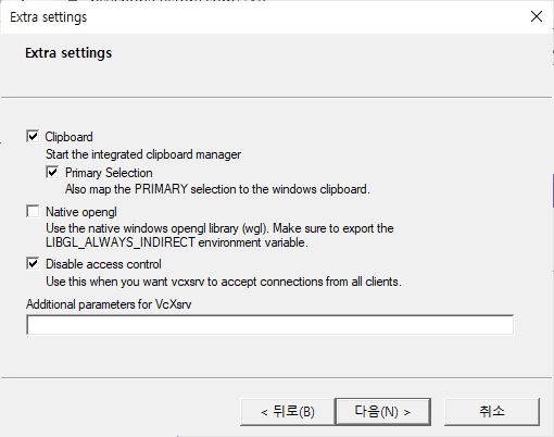 설치 완료후 VcXsrv를 실행하면 다음과 같은 화면이 나온다.