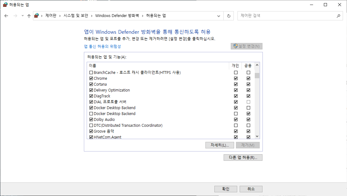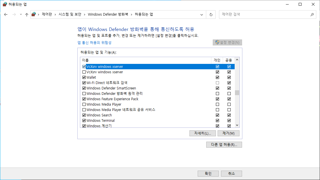 윈도우 디팬더에서 앱 또는 기능 허용 목록에 XLaunch 추가