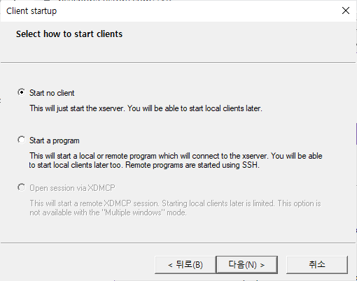디스플레이 세팅은 기본 설정인 Multiple windows를 선택하고 Next를 누르고 이후 start clients 설정부분이 나오는데, Start no client를 선택하고 Next를 누르면 된다.(여기까지는 디폴트 설정)