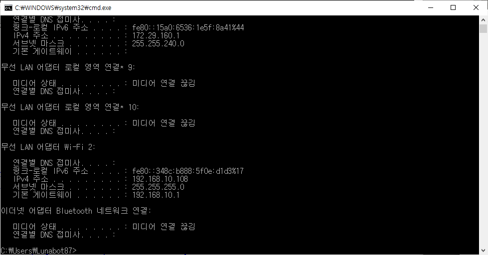 이때 들어가는 IP 주소는 윈도우의 IP 주소로 '윈도우키 + R'을 'cmd'를 입력하여 실행시킨뒤 ipconfig를 통해 확인 할 수있다.