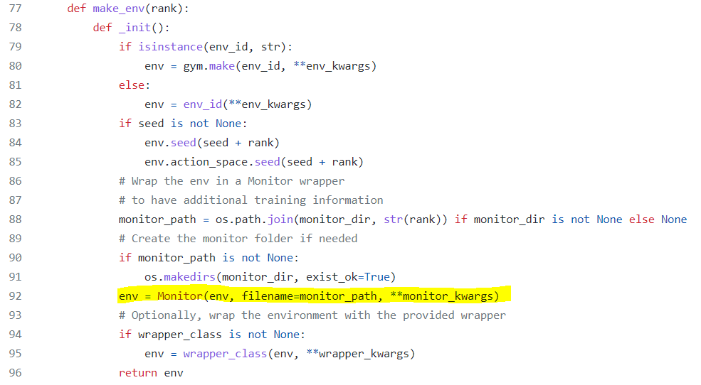 - make_vec_env()의 핵심은 output으로 env를 return하는데, 이 env는 line 92의 Monitor Class에 의해 생성됩니다!