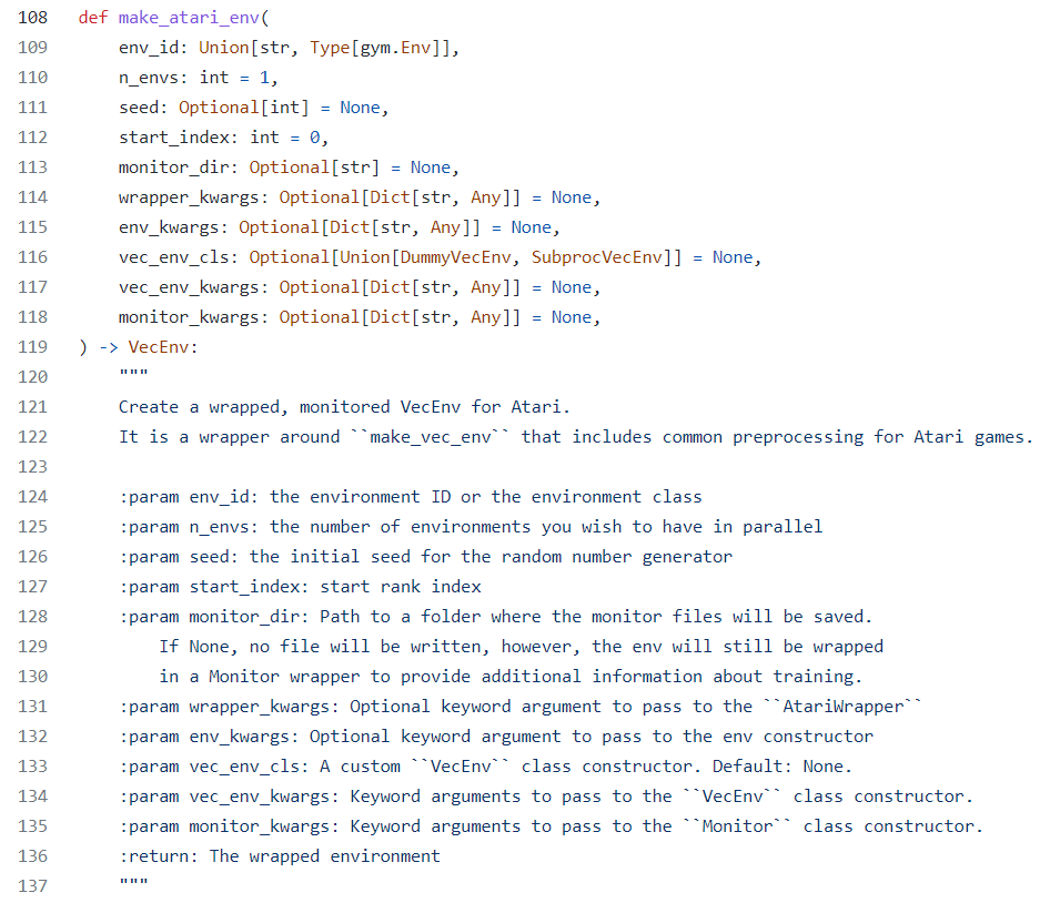 - def make_atari_env()는 이렇게 받은 input을 바탕으로 def make_vec_env()를 output으로 내는 것을 볼 수 있습니다!