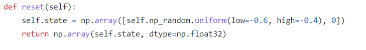 - 또한 초기 위치는 -0.6 ~ -0.4 내에서 랜덤한 위치에서 생성되고, 초기 속도는 0입니다.