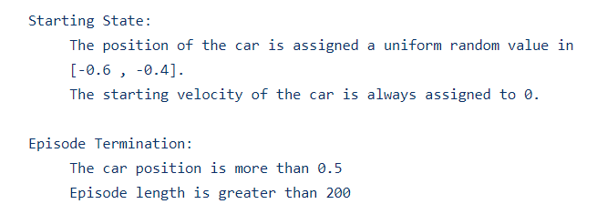 - 에피소드는 car가 산 꼭대기에 도착(=position 0.5)하거나, 타임 스텝이 200이 넘어가면 종료된다고 하네요~