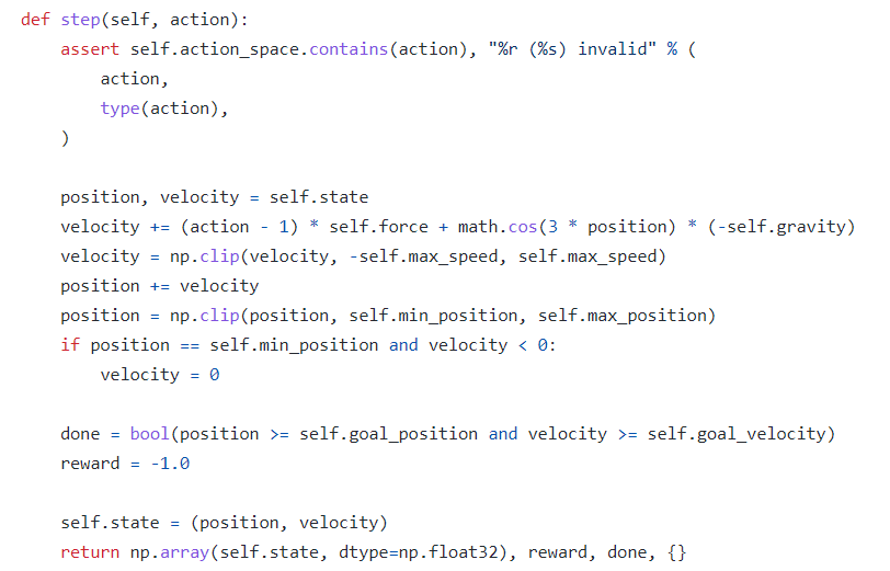 - step 함수를 보시면 action의 값 (0, 1, 2)에 의해 velocity가 정해지고, 이 velocity 값이 position에 영향을 주는 것을 볼 수 있습니다!