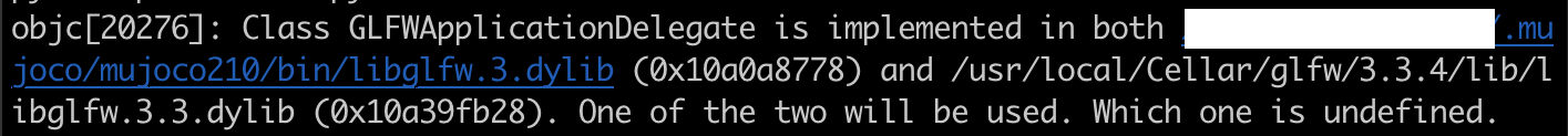 만약 아래의 경고가 나오게 된다면 mujoco210/bin 디렉토리 안에 있는 glfw 라이브러리와 Homebrew로 설치한 glfw 라이브러리가 충돌이 일어나서 생기는 경고이다.