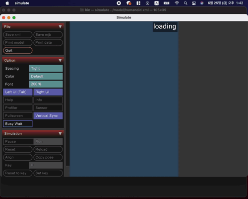 $ cd ~/.mujoco/mujoco210/bin $ ./simulate ../model/humanoid.xml - 위 명령어를 입력 후 아래와 같이 진행이 되면 mujoco 설치가 잘 된 것이다.