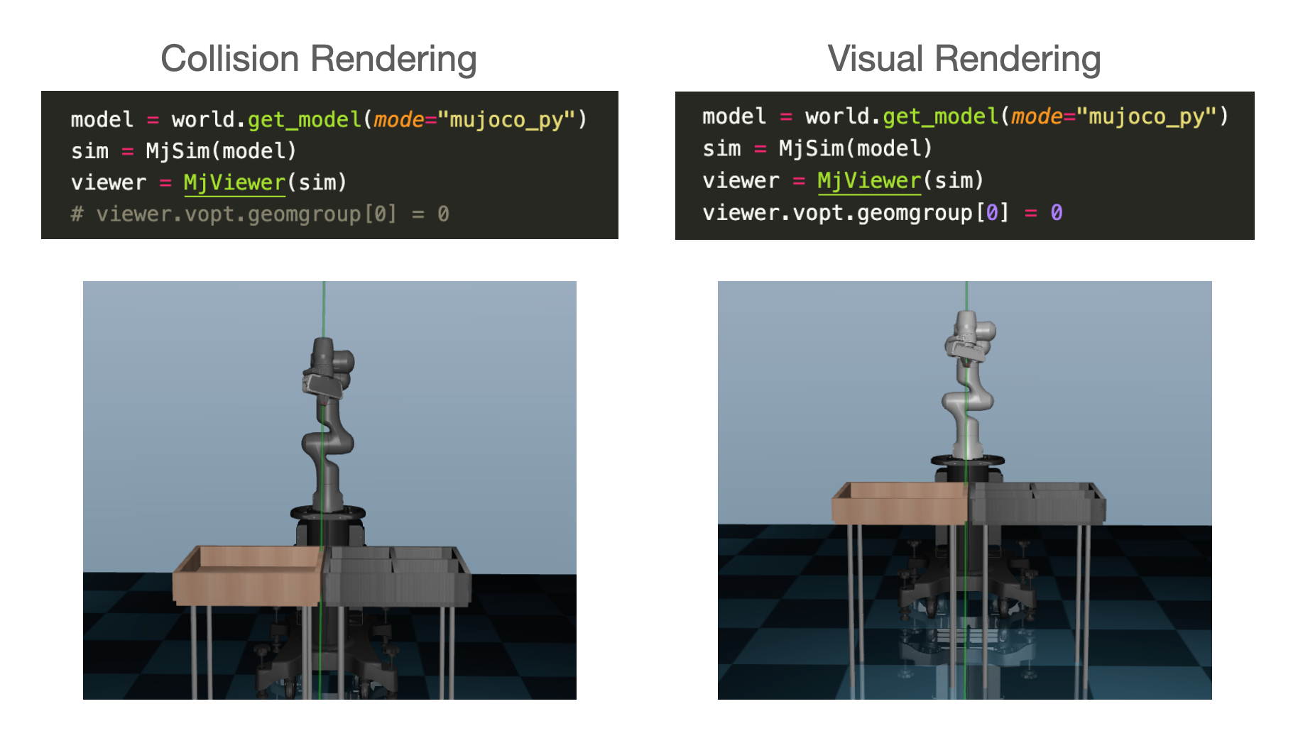 - collision(group='0') 렌더링을 비활성화 하고자 한다면 코드에 viewer.vopt.geomgroup[0] = 0 이라고 적어주면 된다.