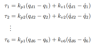 이렇게 되는데, 결국 각 관절의 관성 값이 단위 질량인 시스템이 되버린다. 따라서 PD 제어기를 설계하면 아래와 같이 나온다.
