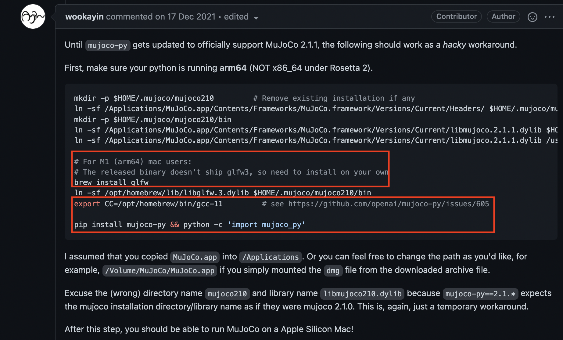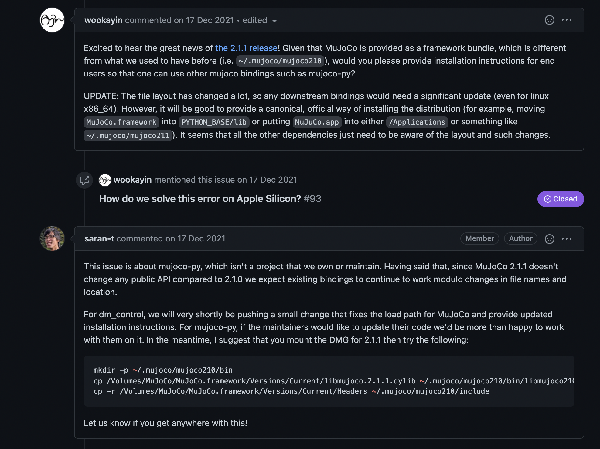 C/C++ 기반의 API를 다룰 수 있다면 상관없겠지만.. 파이썬이 주 언어인 필자는 분명 다른 방법이 있을 것이라는 생각을 하였다. 다행히도 Github Issues 항목에서 mujoco-py 2.1.0을 사용할 수도 있다는 글을 보게되었다.