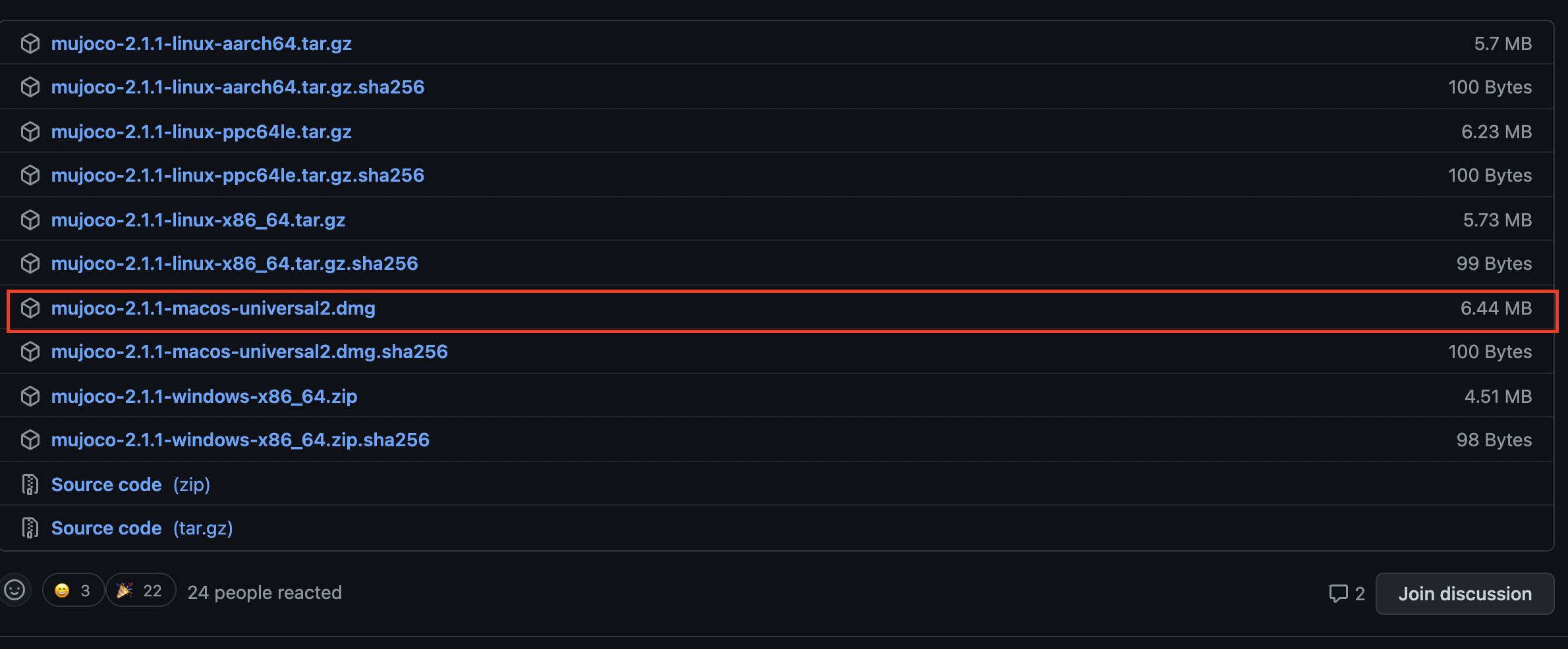 아래의 주소로 들어가서 해당 OS에 맞는 mujoco dmg 파일을 다운로드 한다.