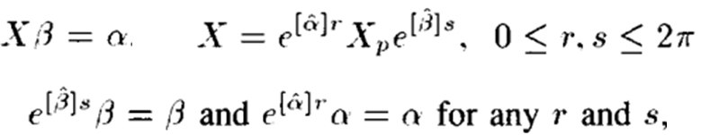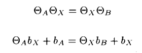 A와 B를 SO(3)의 요소라고 해보자. 이때 A와 B의 Trace는 -1이 아닌 경우라 하자. A와 B의 로그는 [alpha], [beta]로 표기하자. 이때 AX=XB의 particular solution이 Xp이며 이는 SO(3)에 속하는 경우 해는 아래와 같이 표현된다.