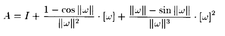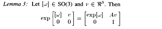 [w]가 SO(3)에 속하고 v가 실수 벡터라면 이들 행렬은 exp형태로 나타낼 수 있고 이는 SE(3)의 요소가 된다. 이때 A 행렬의 경우 Lemma1 을 참고하면 아래와 같이 나타내진다.