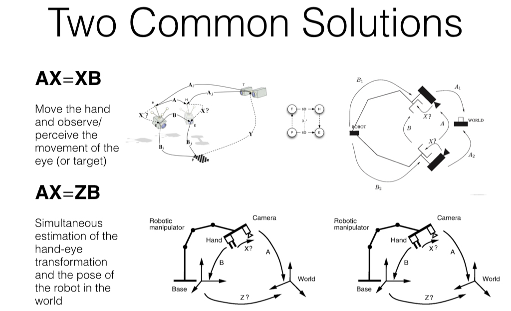 손목축에 달린 센서를 켈리브레이션하기 위해서 A와 B를 알고, X를 모르는 경우를 풀어야 한다. 이때 A 행렬은 임의의 움직임 후 손목 좌표계에 대한 자기 자신(움직인 후의)의 위치(Position)와 방향(Orientation)를 뜻하고, B 행렬 또한 동일한 움직임 후의 센서 좌표계에 대한 자기 자신(움직인 후의)의 좌표계(위치와 방향)을 뜻한다. 이때 X 행렬은 손목축에 대한 센서 좌표계를 뜻한다. 보정은 임의의 움직임을 몇번 한 후 AX=XB 문제를 풀어 X 행렬을 얻어, 정확한 센서의 위치를 얻기 위함이다.
