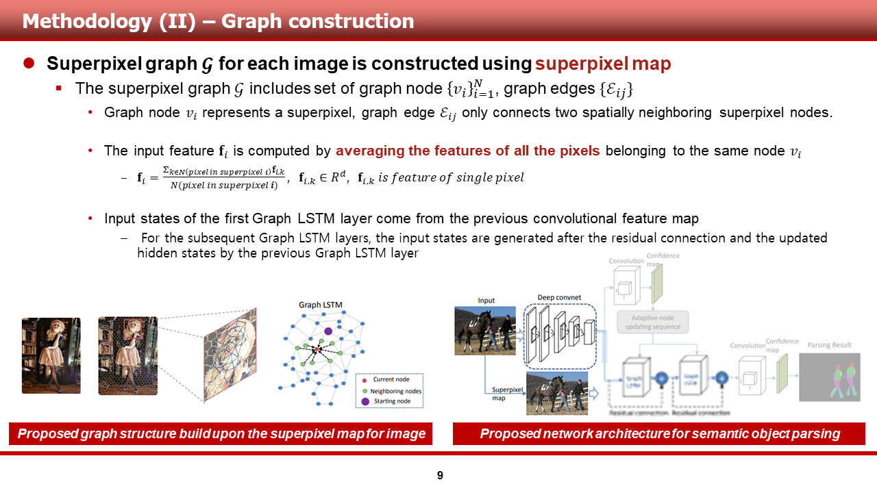 Graph LSTM의 경우, image를 입력 받아, 해당 image의 pixel들이 어떤 의미론적 의미를 가지고 있는지 mapping해주는 오른쪽 아래의 전체 그래프 상에서, 추출된 visual feature들에 global structure context에 대한 이해도를 향상시켜주는 역할을 하고 있습니다. 즉, 단일 모델로써 역할을 하는 친구는 아닙니다.