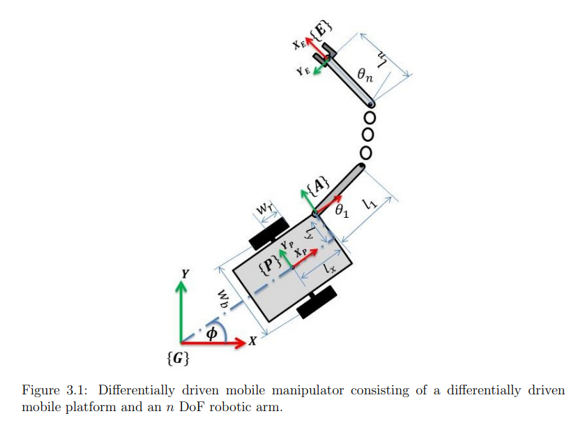 기본적으로 n 자유도의 로봇 팔과 differential driven 형태의 모바일 플랫폼이 합쳐진다. 최종적으로 n+2 자유도를 가지게 된다.
