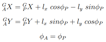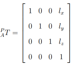 모바일 플랫폼에 대한 로봇 팔의 관계를 표현하기 위해 플랫폼과 로봇 팔의 Base의 방향이 동일하다고 하자. 그렇게 되면 둘 사이의 변환 행렬을 아래와 같이 표현할 수 있고, 이를 통해 Global frame에 대한 로봇팔 Base 식을 표현할 수 있다.
